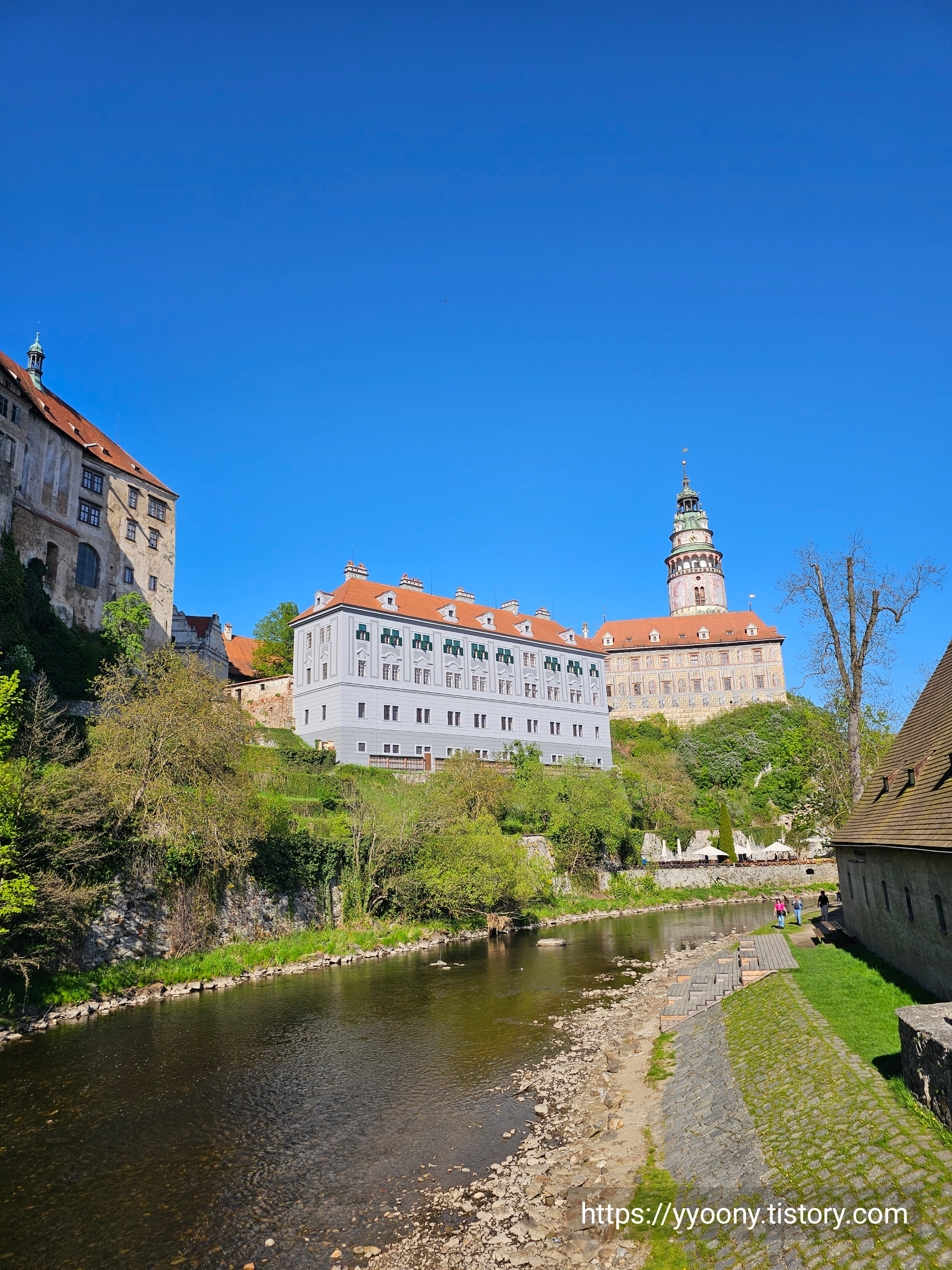 블타바 강변을 따라 계속 체스키크룸로프 성으로 향했고, 강을 건너 망토다리에 도착했다.