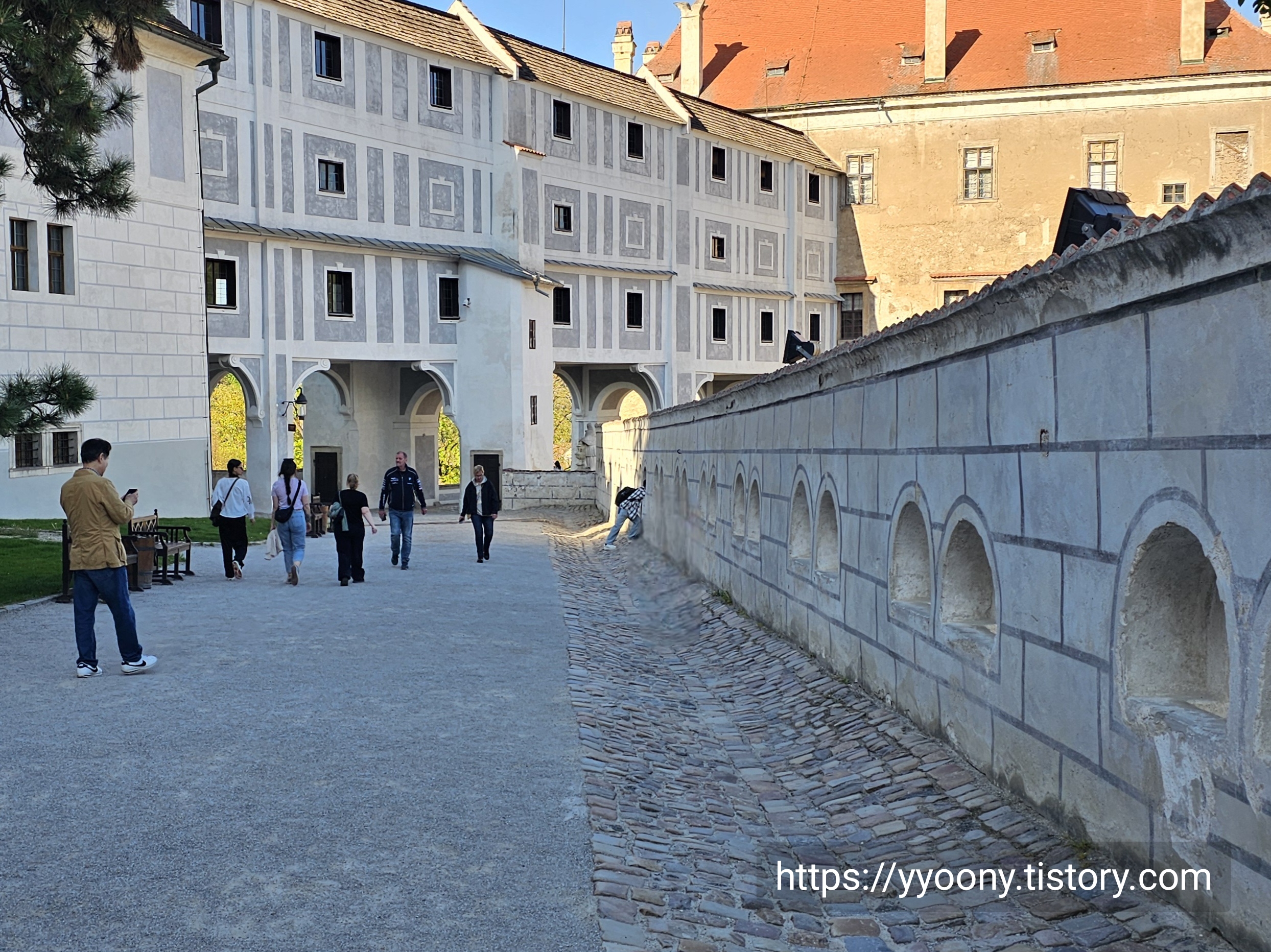 체스키 성은 건축 비용 절감을 위해 벽돌을 사용하지 않고 그림을 입체적으로 그려 벽돌처럼 보이게 하는 양식으로 지었다고 하던데, 진짜 그렇다.
