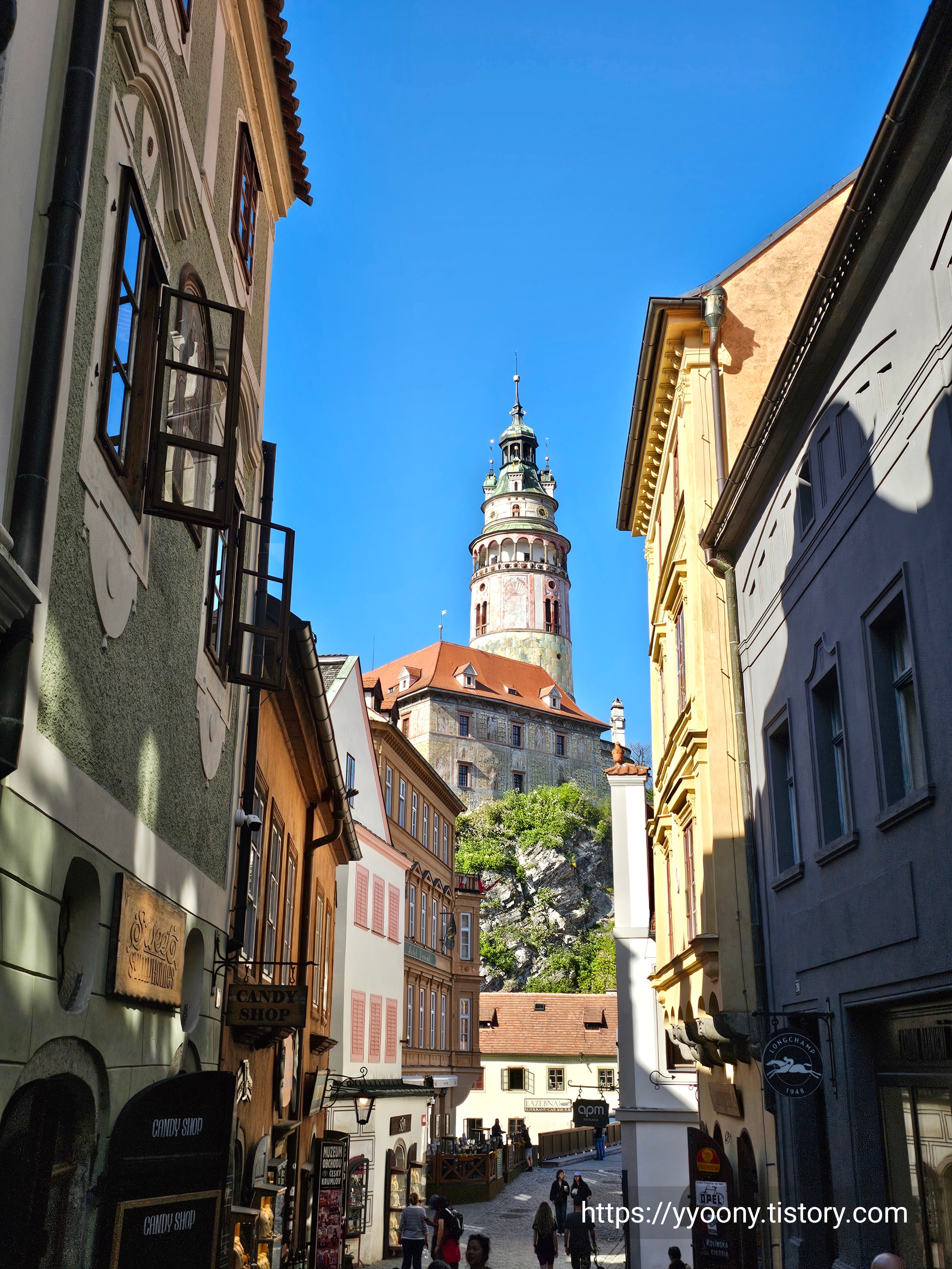 구글 네비의 안내에 따라 광장을 지나 또 다른 골목에 들어서니, 저 멀리 체스키크룸로프 성의 탑이 보인다.